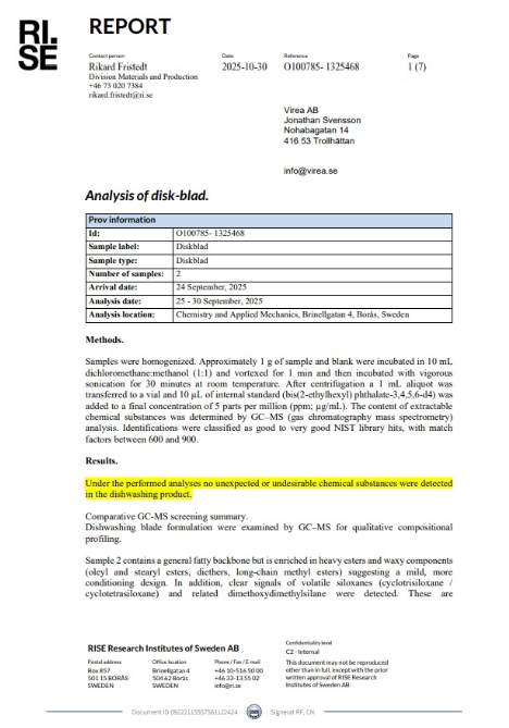 Our dishwasher sheets have been tested by RISE to ensure that they do not contain any unwanted substances. We are committed to offering safe and reliable products of the highest quality.